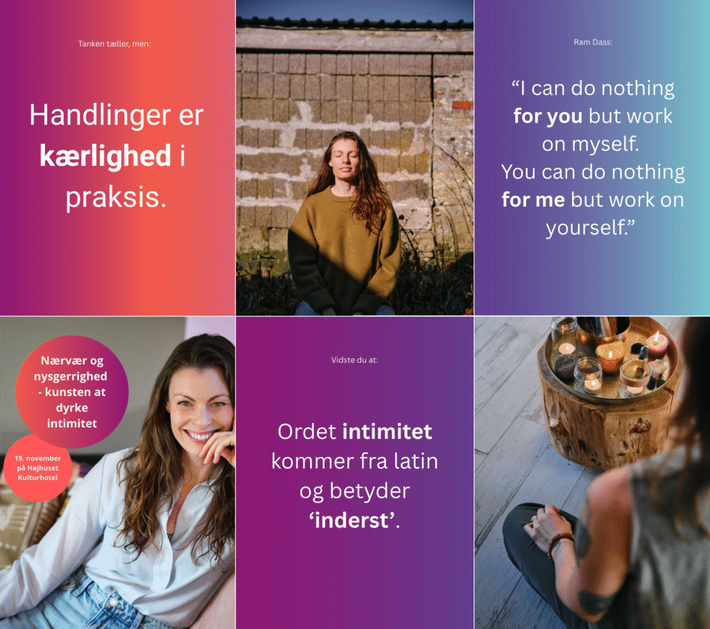 Velkommen! Jeg arbejder med, hvad det vil sige at være menneske, hvad det vil sige at elske, og hvad det vil sige at være i en relation – til dig selv og til andre mennesker.